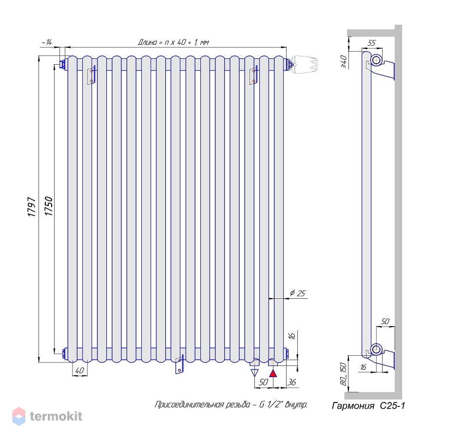 Стальной трубчатый радиатор КЗТО Гармония С25-1 1750 / 24 секции с нижним правым подключением