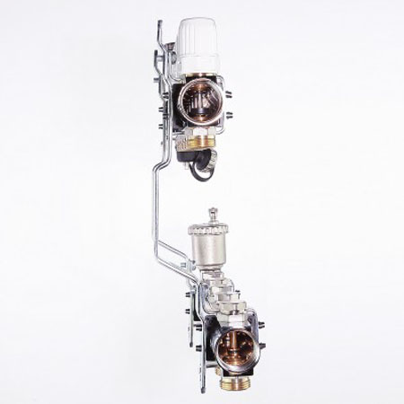 (VTc.594.EMNX) Коллекторный блок для систем водяного радиаторного и напольного отопления (водяной теплый пол) с регулировочными (настроечными) и ручными (с возможностью установки электротермического сервопривода) запорными клапанами, автоматическими воздухоотводчиками и дренажем. Диаметр коллекторов – 1 или 1 1/4". Число выходов – от 3 до 12. Диаметр патрубков – 3/4", резьба – наружная, стандарт присоединения – «евроконус». Рабочая температура теплоносителя – до 120 °С, давление – до 10 бар