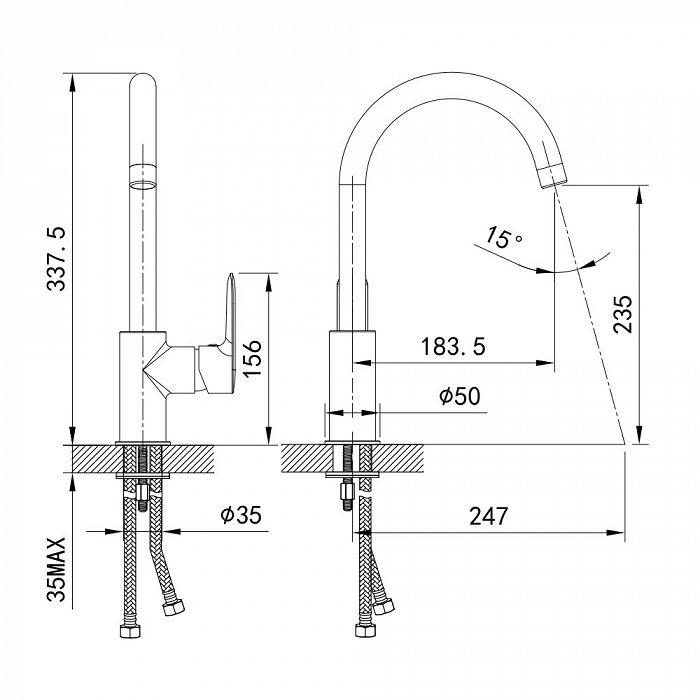 • Смеситель удобен для всей семьи — продуманное соотношение высоты и длины излива и угол наклона аэратора позволяют с комфортом размещать руки под смесителем.